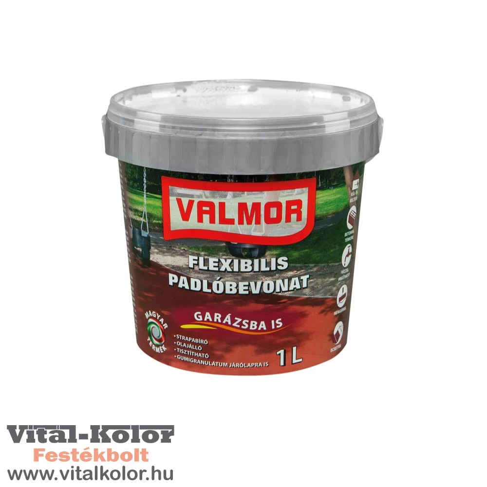 A VALMOR Flexibilis Padlóbevonat egy kiváló minőségű kopás-, olaj- és vízálló, bel- és kültérben használható termék. Alkalmas minden olyan felület bevonására, ahol a cél az átlagos felületi terhelés elvárásainak való megfelelés, családi házas környezetben (játszótéri rugalmas védőburkolat, autóbeálló, járda, műhely, veranda, lépcsők). Dekoratív, esztétikus felületet biztosít fa, vakolt vagy beton lábazatok, kerítések, palatetők, (azbesztes hullámpala nem festhető), bitumenes hullámlemezek állagmegóvó átfestése esetén. A bevonat ellenáll az átlagos, lakossági személygépkocsi terhelésből adódó igénybevételeknek, itt a festendő felület kizárólag jó nedvszívóképességgel rendelkező betonfelület lehet. A bevonat matt, finom kvarclisztet tartalmaz, ezért a felmosása nehézségekbe ütközik. Könnyebben tisztítható, ha FACTOR Aqua Parkettalakkal kezeljük beltérben a felületet. Amennyiben a könnyebb tisztántarthatóság fontos szempont, ajánljuk VALMOR Garázsfestékünket.