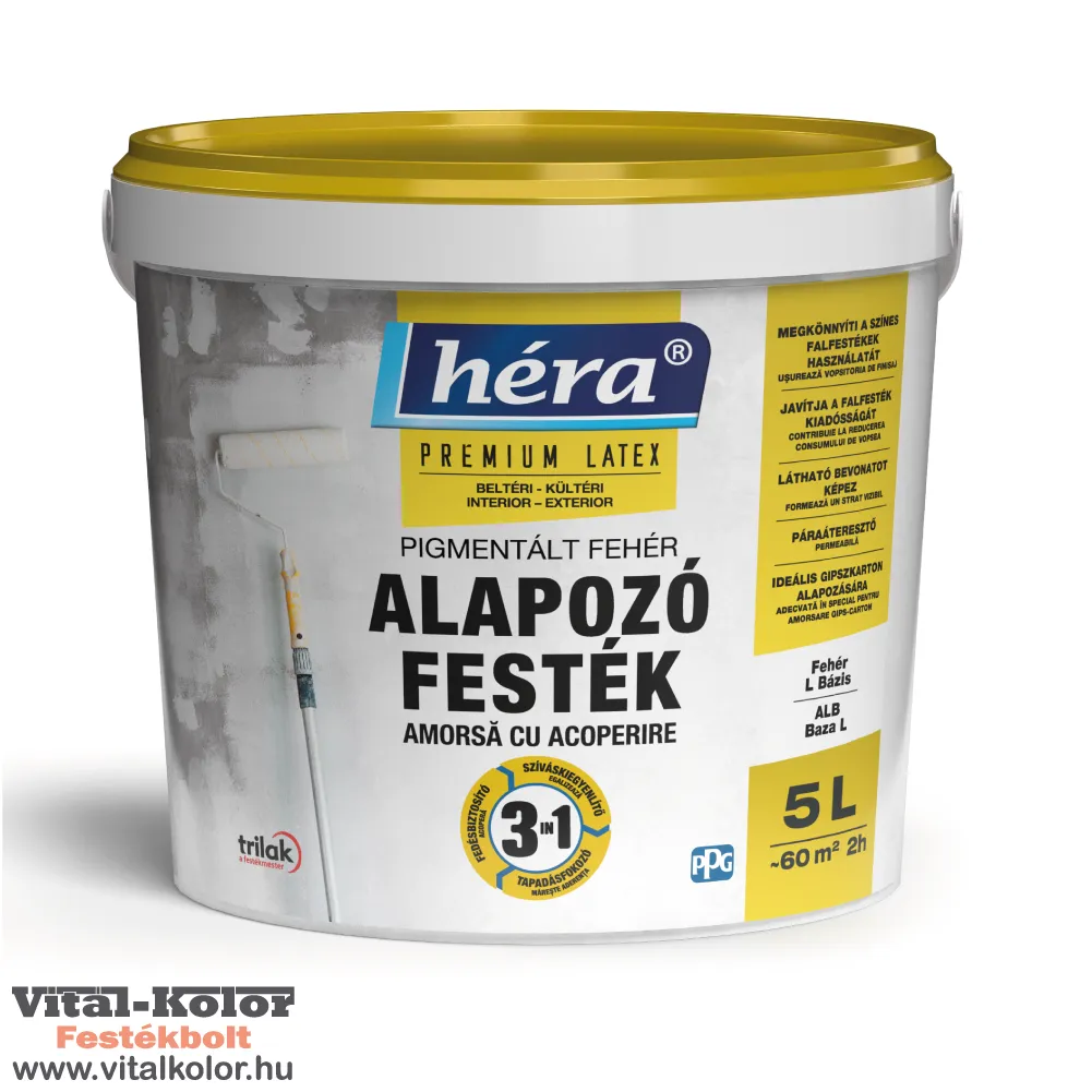 Kiegyenlíti a felület szívóképességét, biztosítja a megfelelő fedőképességet és fokozza a falfestékek tapadását. Használatával elkerülhetőek a színeltérésekből fakadó kivitelezési hibák, ezáltal szebb, egységesebb végső megjelenés érhető el. Különösen ajánlott alapozóként minden diszperziós beltéri és kültéri Héra falfestékhez.